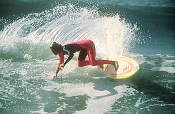 A true legend: Mark Richards. Humble, unique gawky style. He won four titles even though he was riding twin fins in Hawaii. Ever tried a twin in huge hollow waves? It's pretty hard not to spin out. Instead of spinning out, MR did these bizarre turns, like the shot below. Check the track: he's going really, really fast, sliding tail, doing a double arm layback, and he still looks smooth and in control. This is one of those rare turns that still looks fresh and innovative, nearly 20 years later.